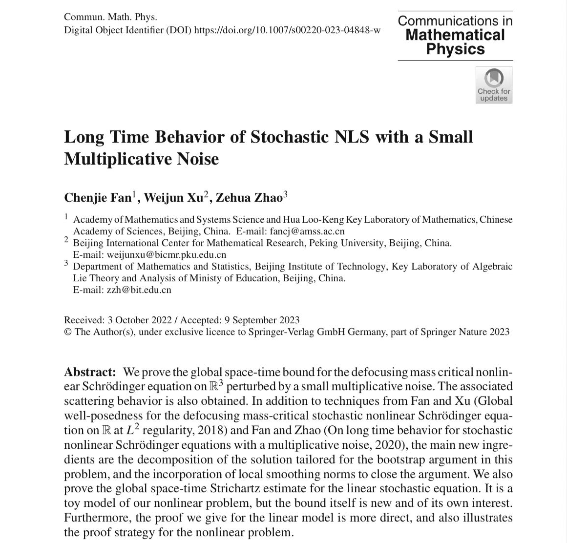 日前,36365线路检测中心no1教师赵泽华(通讯作者)与中科院数学与系统科学研究院教师范晨捷、北京数学中心教师许惟钧合作在期刊《Communications in Mathematical Physics》上合作发表题为《Long Time Behavior of Stochastic NLS with a Small Multiplicative Noise》的研究论文。该论文研究方向为随机偏微分方程,得到了带小可乘噪音的随机型薛定谔方程的长时间行为结果,使得此结果的成立不需要此前德国著名数学家Röckner教授团队关于噪音的衰减假设(Herr-Röckner-Zhang [Comm. Math. Phys., (2019) 368, 843-884])。