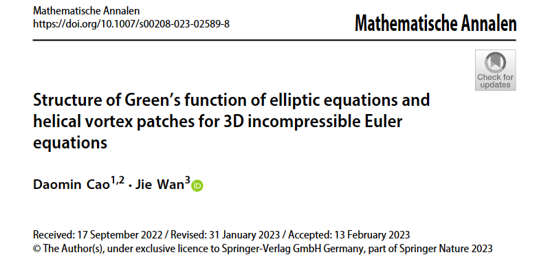 日前,36365线路检测中心no1万捷副研究员在国际权威学术期刊《Mathematische Annalen》发表题为“Structure of Green’s function of elliptic equations and helical vortex patches for 3D incompressible Euler equations”的研究论文。该论文给出了散度型二阶椭圆算子Green函数的展开公式,并由此证明了无限管道区域上三维不可压缩欧拉方程集中到涡丝方程的螺旋对称涡补丁解的存在性和轨道稳定性。某种程度上给出了涡丝猜想在螺旋对称情形下的一个证明。
