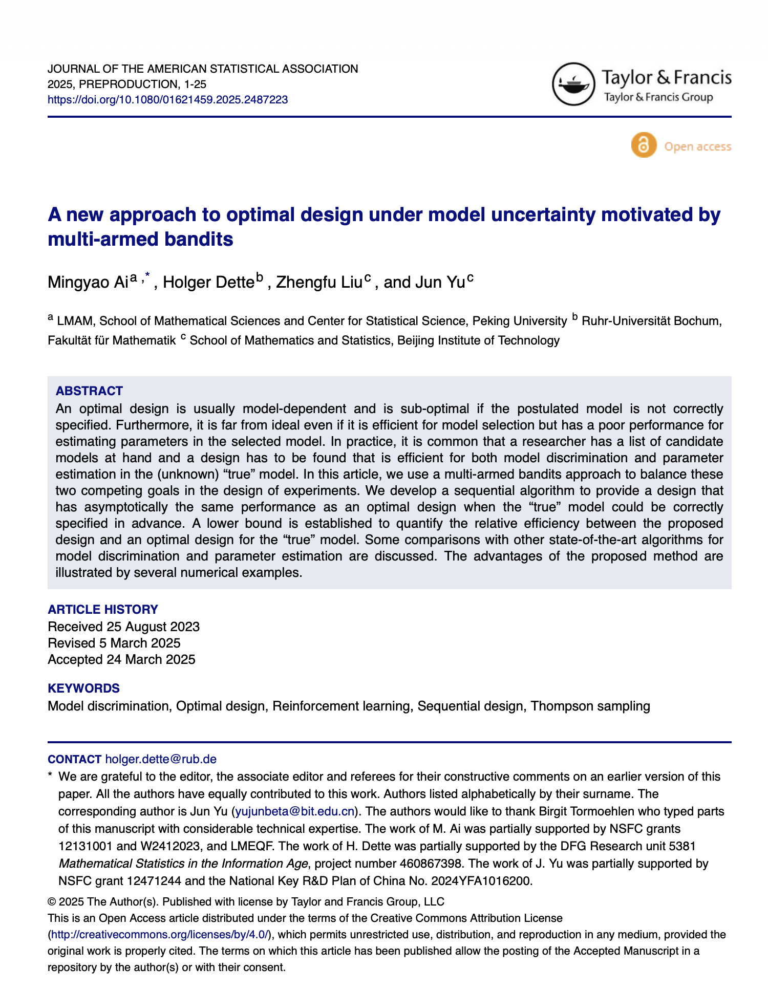 A new approach to optimal design under model uncertainty motivated by multi-armed bandits一文针对如何在一组候选模型的情形下做最优设计的问题,从多臂赌博机问题中得到启发,提出了一种在模型判别和参数估计间做平衡的序贯设计方法。在“真实”统计模型未知,但被认为包含在一组候选模型中的情况下,如何进行最优试验设计一直是统计领域广泛研究且具有根本性挑战的问题。在最优设计领域,如何安排合理的试验,使得收集的数据对模型选择与参数估计都有帮助是一个公开的难题。尽管已有诸多研究尝试解决此问题,包括贝叶斯方法(通过最大化期望信息增益)与频率学派方法(通过非序贯或序贯方式的最优设计),这些方法普遍存在诸如计算复杂度高、在参数估计或模型判别方面效率低下等局限性。上述论文提出一种创新思路,基于Thompson采样策略设计了一个序贯试验设计算法,能够自适应地平衡探索与利用,在模型判别与参数估计两方面都实现近似最优效率。该方法不仅在理论上提供了有限样本下的效率下界保证,还在多个实例中展现出优异的实际表现,标志着对这一长期难题的重要突破。